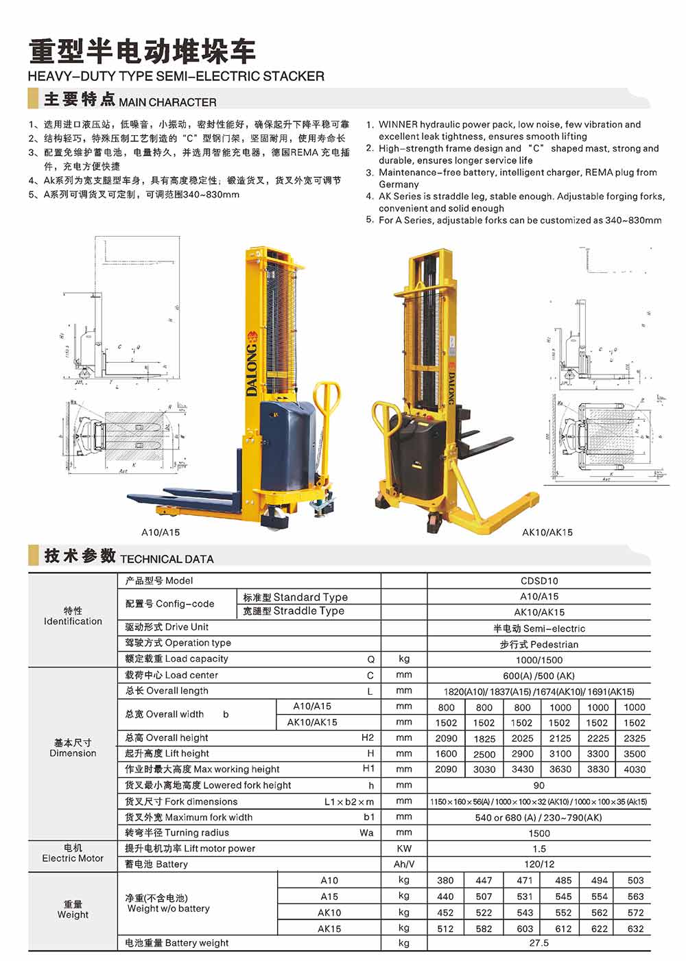 CDSDAK半電動堆垛車(重型,寬支腿)